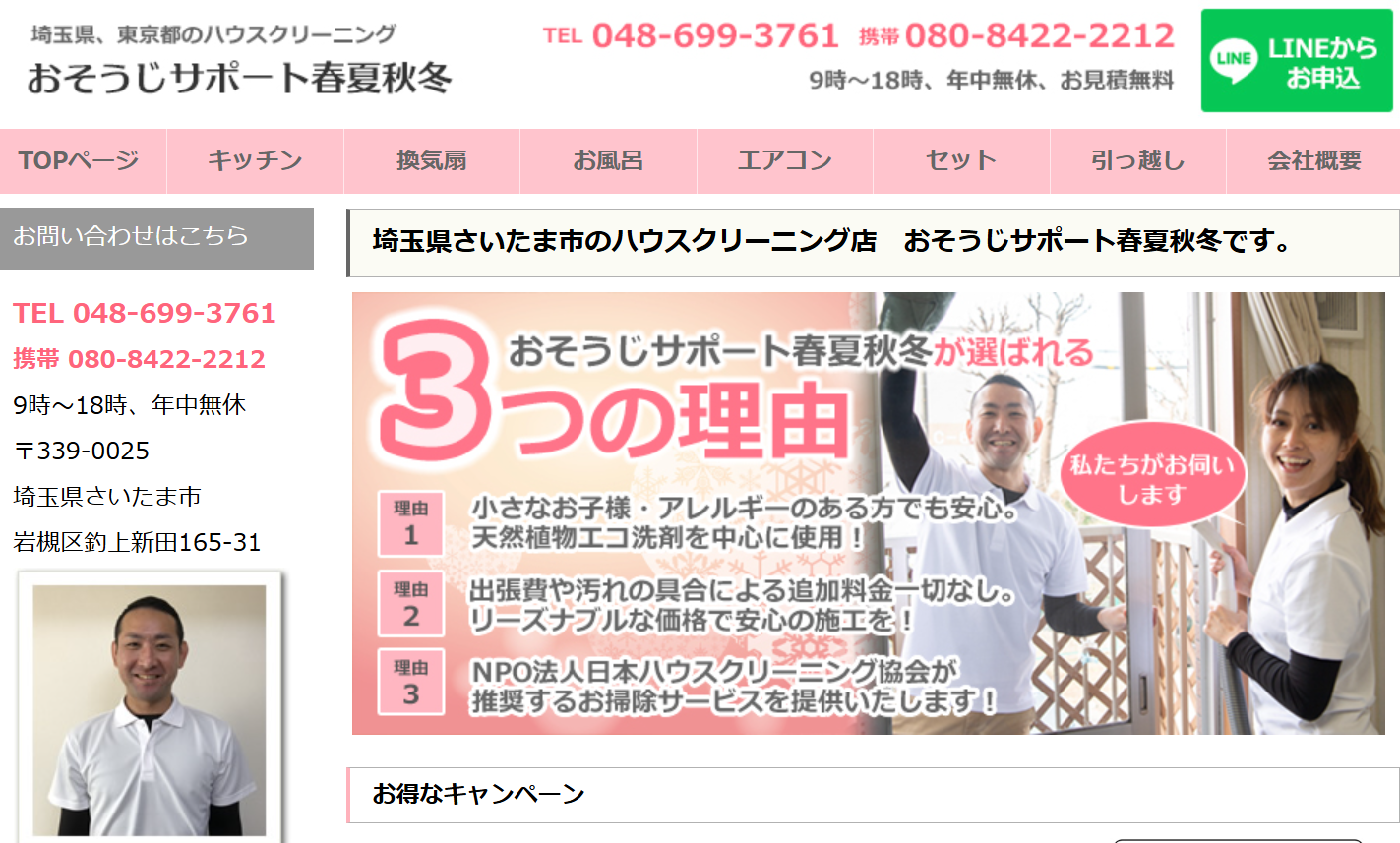 おそうじサポート春夏秋冬は、埼玉県でエアコンクリーニングを行っている業者です。天然植物エコ洗剤を使用したエアコンクリーニングなので、小さなお子様やペット、妊婦さん、アレルギー持ちの方でも依頼できるところが魅力。