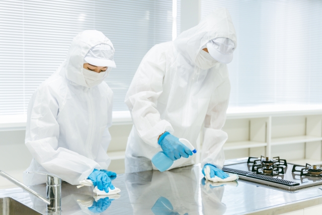 特殊清掃業者は、オゾン脱臭機や高性能な消毒液を使って、空間全体の除菌・脱臭を行います。感染防止のために作業員は防護服を着用し、専門的な手順で清掃を進めます。