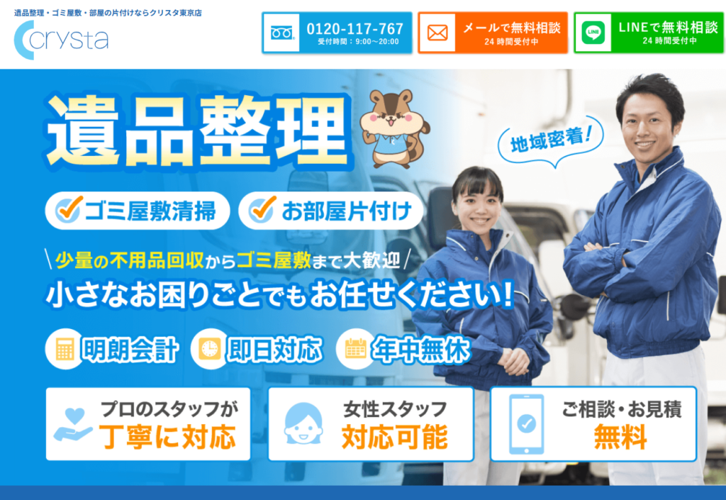 | 1 | クリスタ | 4.8/5.0 | 問い合わせ当日に見積もり・作業可能 | 東京都全域 | 提携◯ | 在籍◯ | 加入済◯ | 対応可◯ |