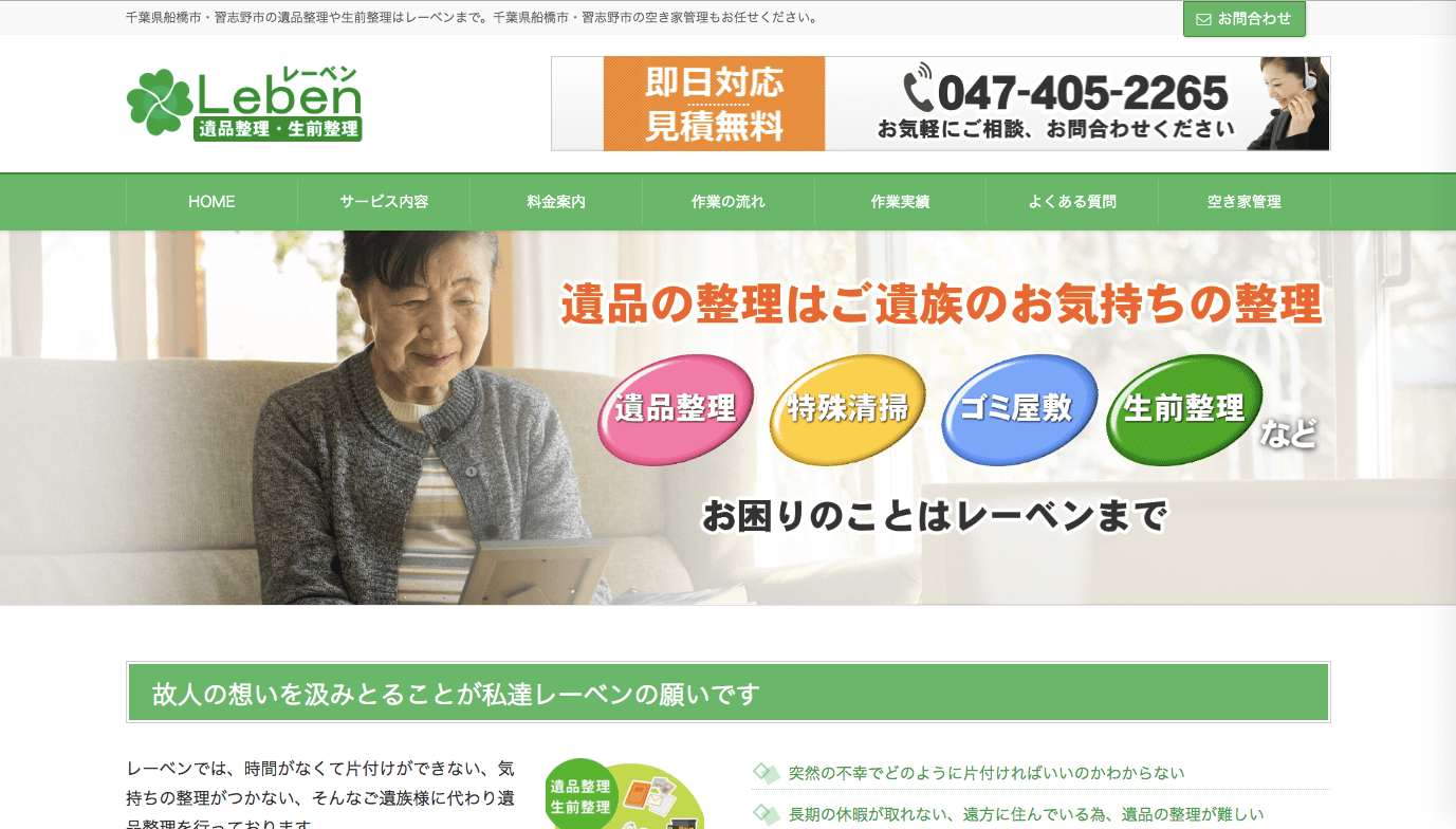 Leben(レーベン)は、遺品整理の他にも生前整理、ゴミ屋敷の片付け、特殊清掃などのサービスにも対応していますので、一度にさまざまな業務を頼むことができます。