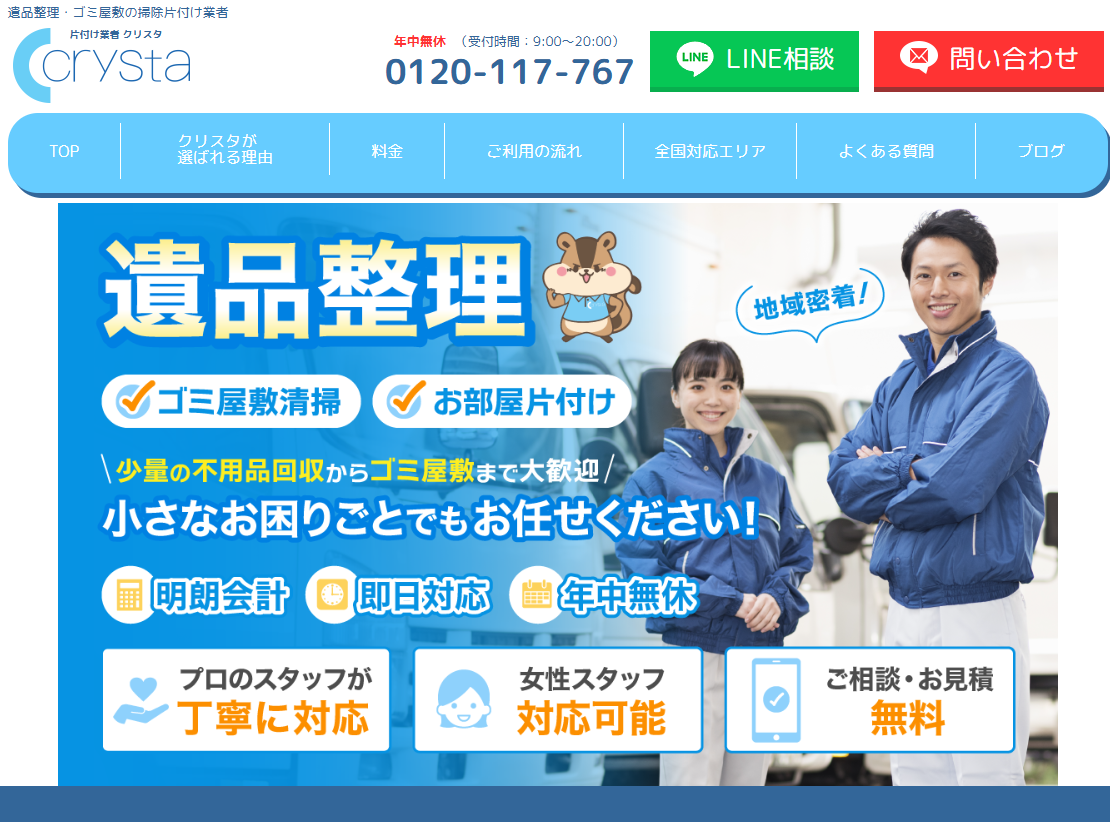 Crysta(クリスタ)は、東大阪市でも高評価を獲得する全国展開の特殊清掃業者です。東大阪市にも対応していて、遺品整理士や特殊清掃士の資格を持つスタッフが在籍。年中無休で対応していて・明朗会計のパック料金制など、初めてでも依頼しやすい環境が整っています。
