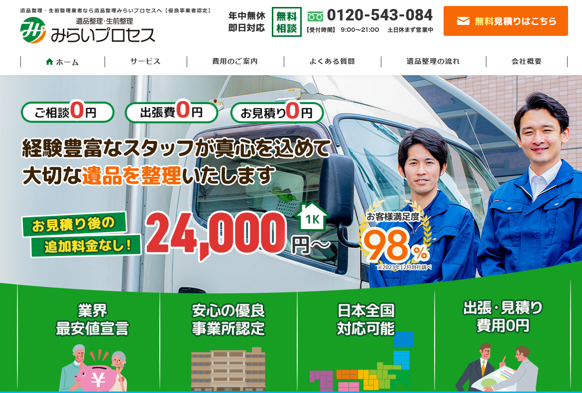 遺品整理みらいプロセスは、全国47都道府県に拠点を構えるスケールの大きな遺品整理専門業者です。同社の魅力は「地域密着のきめ細かさ」と「真心ある対応」にあります。