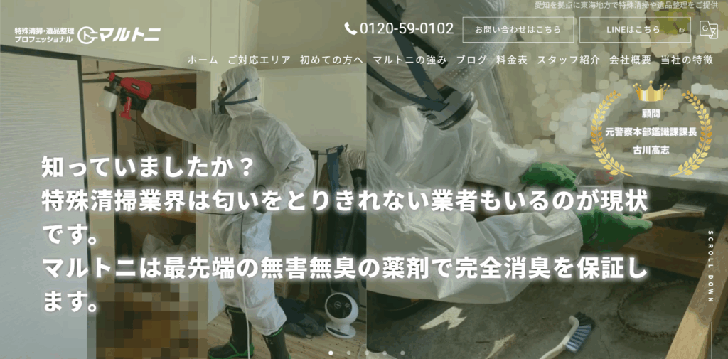 マルトニは、東海3県を中心に活動している地域密着型の特殊清掃業者です。遺品整理士が在籍しており、特殊清掃・遺品整理・家財買取・供養・リフォーム・解体・不動産関連等、ワンストップで対応できるのが特徴です。