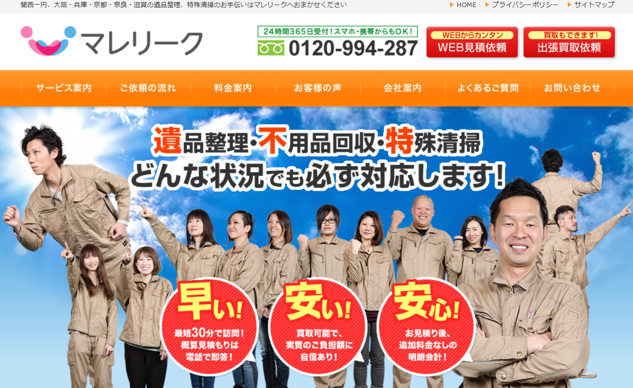 マレリークは、大阪府寝屋川市に本店を構え、関西一円(大阪・兵庫・京都・奈良・滋賀)をはじめ、神奈川・静岡など関東まで幅広い地域で、遺品整理や特殊清掃、不用品回収を行っています。在籍スタッフの多くは実務経験10年以上なので、作業に信頼がおけるでしょう。