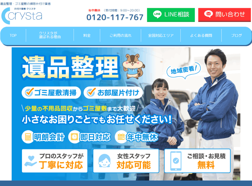 Crysta(クリスタ)は、全国各地でゴミ屋敷清掃やお部屋片づけ、遺品整理、特殊清掃などを行っている業者です。東京店は東京都全域に対応。年中無休かつ24時間受け付けているので、迅速な対応が可能です。
