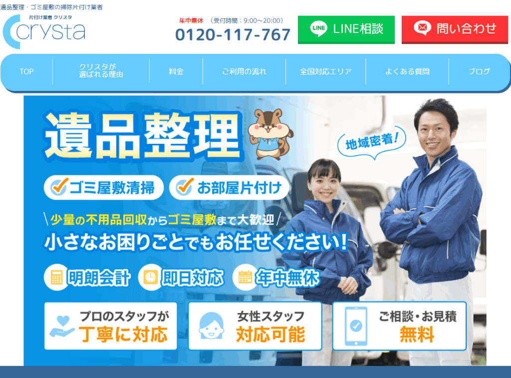Crysta(クリスタ)は、特殊清掃や遺品整理をはじめ、ゴミ屋敷清掃・お部屋の片付けまで幅広く対応している業者です。見積もり後の追加費用は一切なく、電話・LINEでの無料見積もりから当日作業までスピーディーに対応。深夜や早朝の依頼にも応じてくれるため、急を要する現場にも頼れる存在です。