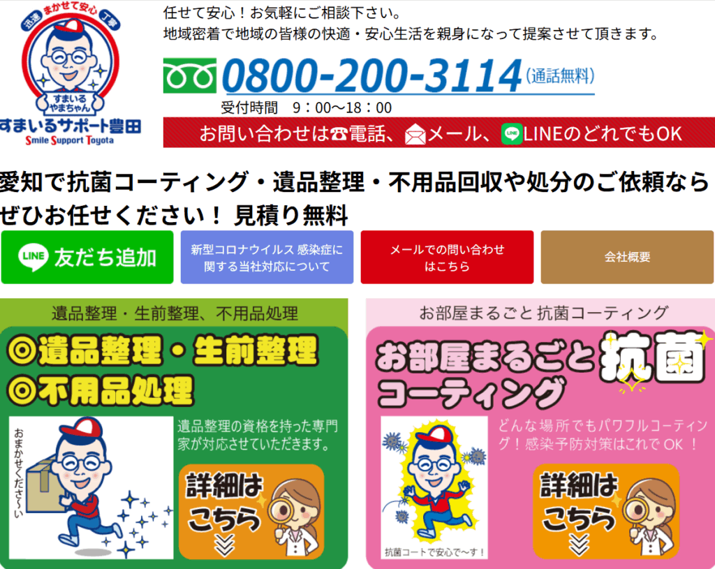 | 6.すまいるサポート豊田 | ![]() | 3.5/5.0 | 公式 | 記載なし | 記載なし | ◯ 無料 | ◯ 加入済み | ◯ 有り | ◯ 有り | ◯ 有り | ◯ 法人 | 9:00~18:00 | 記載なし |