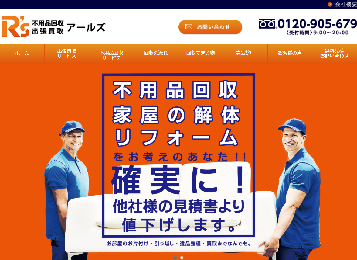 | 7.アールズ | ![]() | 3.5/5.0 | 公式 | 20,000円~ | 記載なし | ◯ 無料 | 記載なし | ◯ 有り | ◯ 提携 | ◯ 有り | ◯ 法人 | 9:00〜20:00(年中無休) | 現金、クレジットカード |