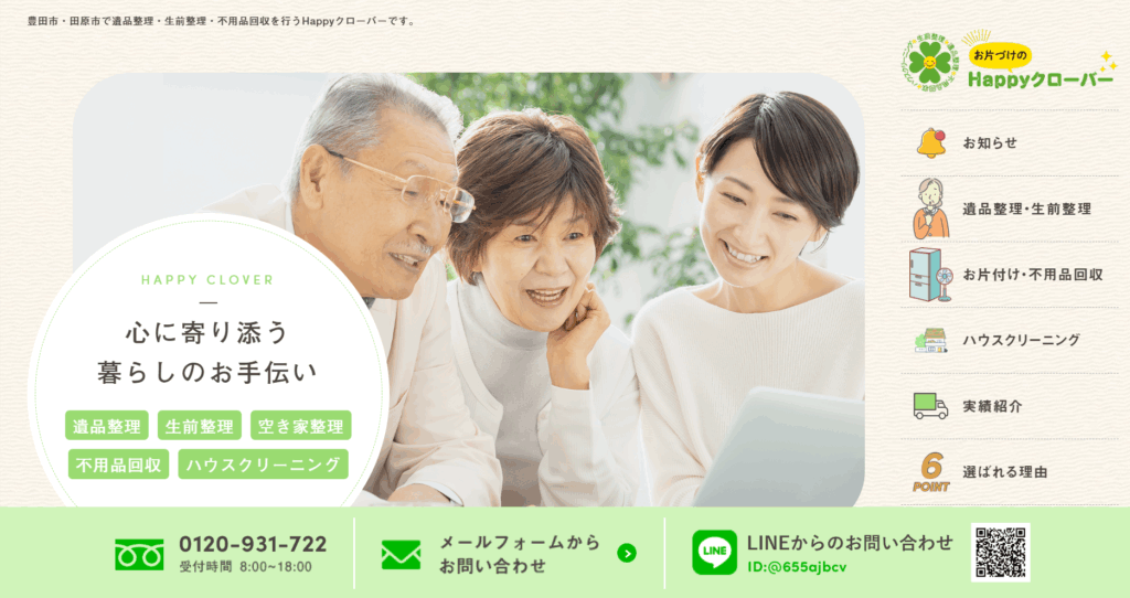 happyクローバーは、愛知県豊田市を中心に遺品整理・生前整理・不用品回収など、多彩なサービスを提供する企業です。遺品整理士による整理や相続に関する相談に加え、生前整理にも対応し、お客様の心理的負担を軽減しながら身の回りを整える支援を行います。
