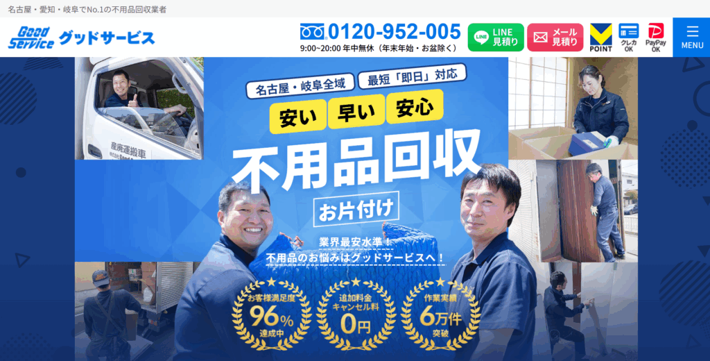 | 4.グッドサービス | ![]() | 4.0/5.0 | 公式 | 37,620円~ | ◯ 可能 | ◯ 無料 | 記載なし | ◯ 有り | ◯ 提携 | ◯ 有り | ◯ 法人 | 9:00~20:00 | 現金、銀行振込 |