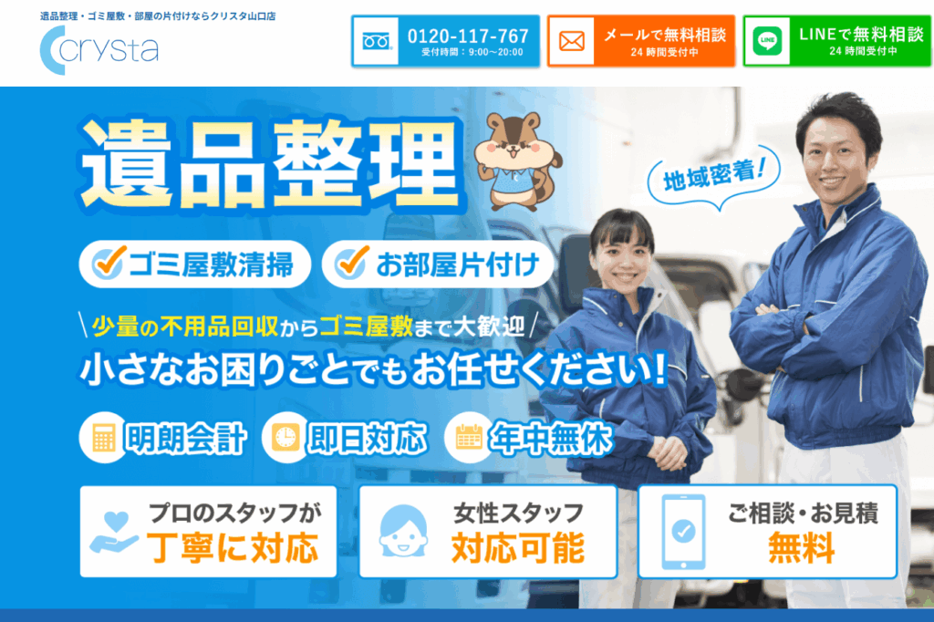 | 1 | クリスタ | 4.8/5.0 | 秘密厳守で近隣にも配慮 | 山口県全域 | 提携◯ | 在籍◯ | 加入済◯ | 対応可◯ |