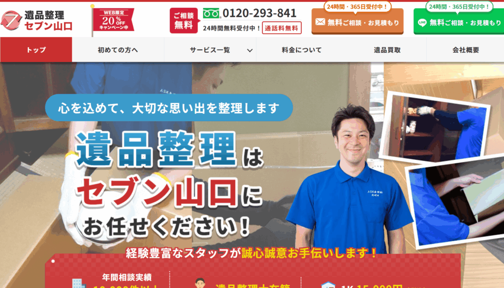 | 2 | 遺品整理 セブン山口 | 4.5/5.0 | 創業10年以上・年間相談実績1万件以上 | 山口県全域 (一部除く) | 提携◯ | 在籍◯ | 加入済◯ | 対応可◯ |