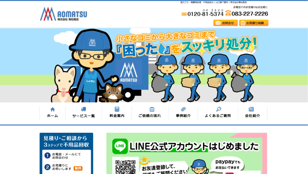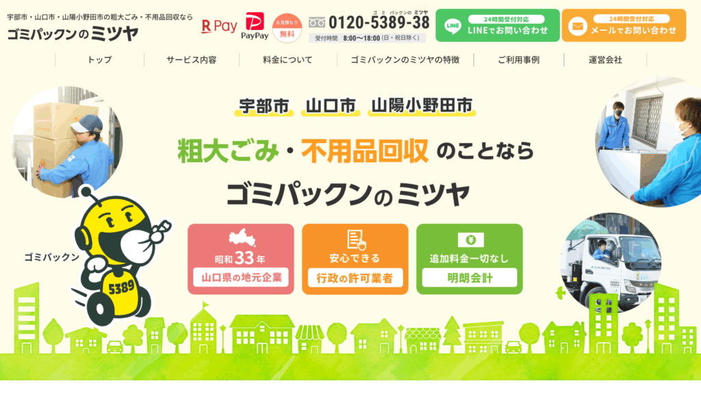 | 5 | ゴミパックンの ミツヤ | 3.5/5.0 | 遅い時間帯や土曜日も対応可能 | 山口県全域 (一部除く) | 有り◯ | 記載なし | 加入済◯ | 対応可◯ |