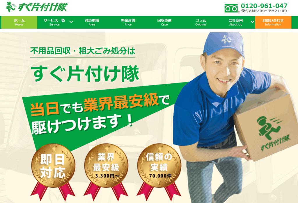 強みは、見積もり後の追加費用が一切ない明朗会計と、必要な物を処分しない独自の仕分けサービスです。そして、当日見積もりと作業の両方が可能で、深夜や早朝の作業にも応じてくれる点も魅力。「片付けたいけど何から始めればいいかわからない」「仕分けも一緒に手伝ってほしい」という方におすすめの業者です。