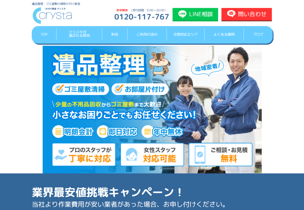 遺品整理業者を自分で探すのが大変な場合は、当サイト「クリスタ」でも遺品整理を承っています。現地訪問・お見積もりにも対応していますので、まずは状況のご相談だけでも大丈夫です。