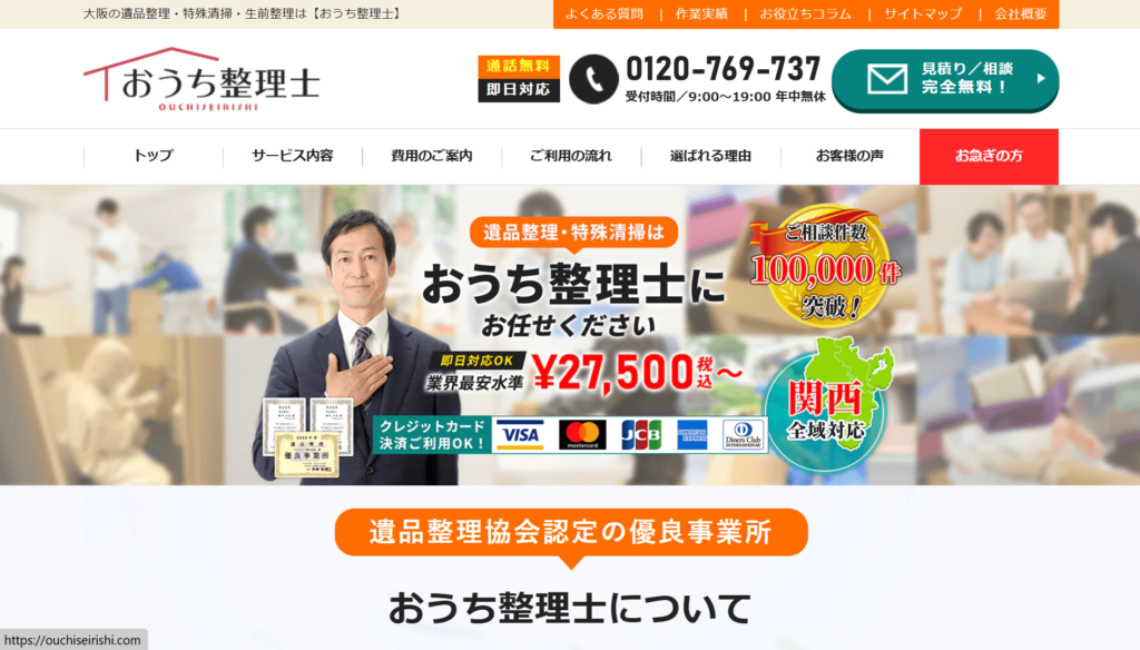 | 3 | おうち整理士 | 4.0/5.0 | あらゆる悩みを1社で解決 | 大阪府全域 (一部除く) | 提携◯ | 在籍◯ | 記載なし | 対応可◯ |