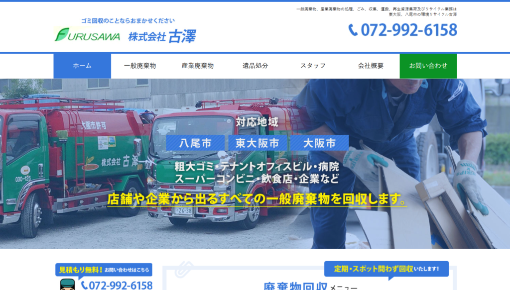 | 8 | 株式会社古澤 | 3.5/5.0 | 廃棄される物を極力資源として活用 | 大阪府全域 (一部除く) | 有り◯ | 記載なし | 記載なし | 記載なし |