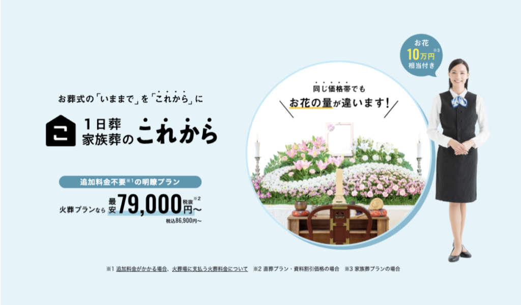 「1日葬・家族葬のこれから」は、全国どこからでも利用できる 明朗価格の家族葬サービスです。 これまでの家族葬は、本来小規模で良いはずが、料金が高騰したり、必要以上に豪華・大きな式になってしまうことも少なくありませんでした。