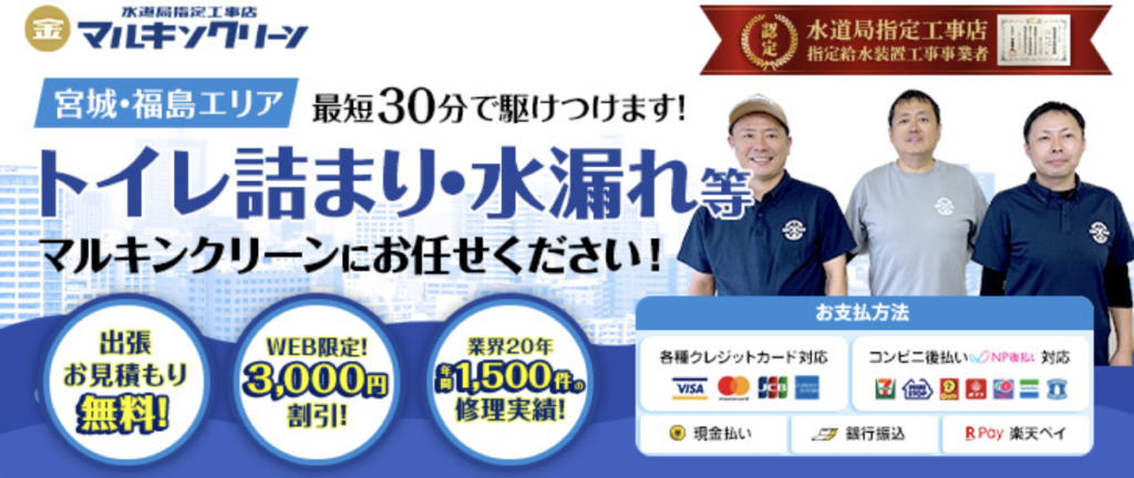 急な水漏れや詰まりから、水回りのリフォームまで、マルキンクリーンは幅広く対応しています。支払い方法も現金・クレジットカード・銀行振込・コンビニ後払いなど多様で、利用者の利便性に配慮。